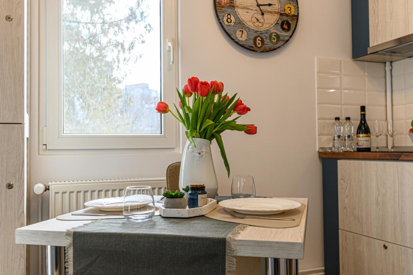 Apartment. The apartment features 1 bedroom and 1 bathroom with a shower and free toiletries. The well-fitted kitchen has a stovetop, a refrigerator, kitchenware and a microwave. The apartment provides a flat-screen TV with streaming services, a tea and coffee maker, a dining area, a wardrobe as well as a quiet street view. The unit offers 1 bed.