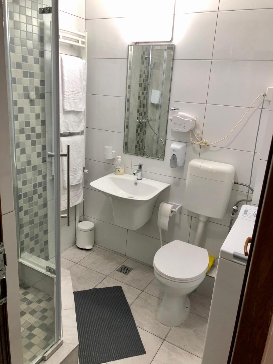 Family Room with Bathroom. The family room provides a washing machine, a private entrance, as well as a private bathroom featuring a shower and a hairdryer. Boasting a terrace, this family room also features a sofa, a tiled floor and a flat-screen TV. The unit offers 2 beds.